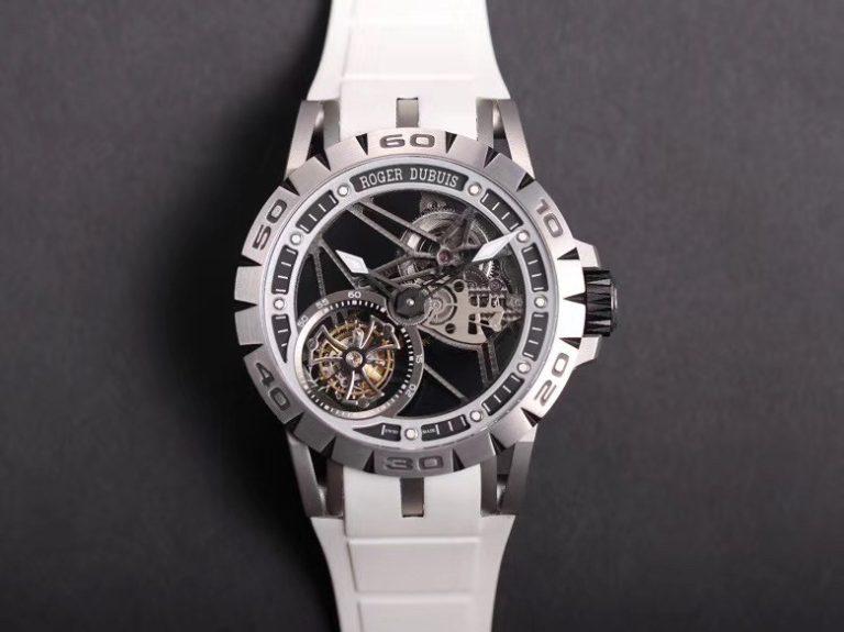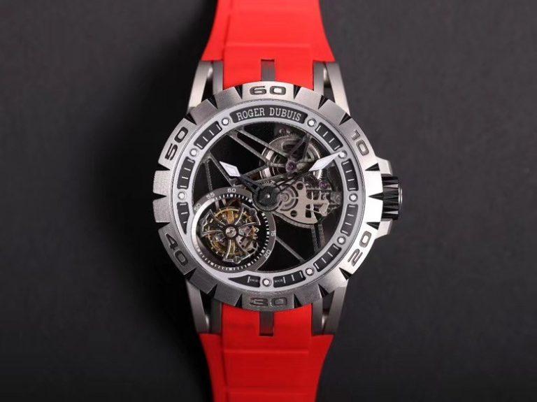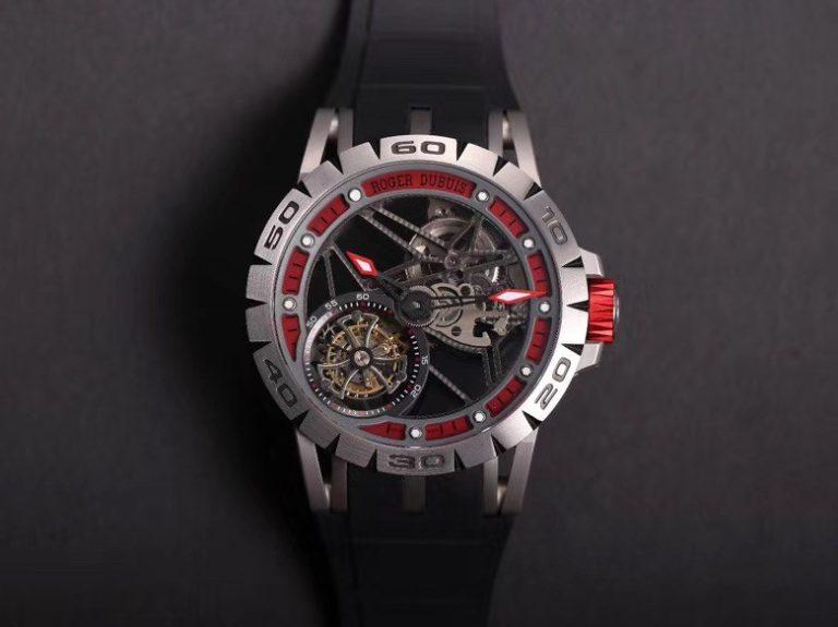 JB廠羅傑杜彼Excalibur Spidr RDDBEX0479,以45mm鈦金屬鏤空飛行陀飛輪設計展現超跑風範。搭載定製RD505SQ手動上鏈機芯,金色擺輪配重釘,穩定且高達98%相似度。藍寶石防刮鏡面、進口橡膠錶帶與原裝摺疊扣,造型霸氣炫酷,辨識度極高,是跑車愛好者的理想腕錶。