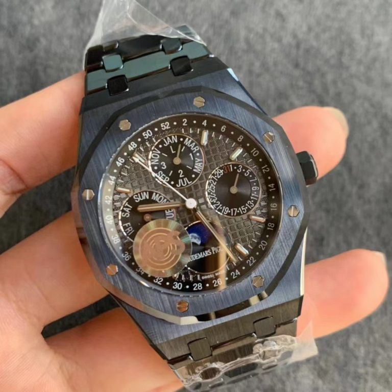AP皇家橡樹26579CE萬年曆腕錶,黑色PVD不鏽鋼錶殼搭配41mm經典八角設計,搭載5134自動機芯,實現日期、星期、月份、周曆全功能顯示。防眩光藍寶石鏡面、AP字樣摺疊扣與背透設計,外型硬朗、功能齊全,堪稱黑魂控必收款。